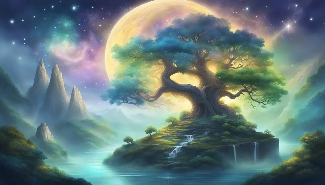 Yggdrasil stands at the center of Norse cosmology, connecting all Nine Worlds through its immense branches and roots. In mythic narratives, the Dream Realm is sometimes understood as a reflection or offshoot of Yggdrasil, accessible through dreams or altered states.